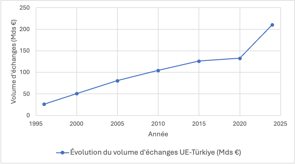Depuis la mise en œuvre de l’union douanière, les échanges de biens entre l’UE et la Türkiye ont fortement augmenté. Le commerce bilatéral est passé d’environ 33 milliards de dollars en 1996 à 178,6 milliards de dollars en 202112. En 2024 il dépasse 210 milliards d’euros2. La figure 1 retrace l’évolution du volume échanges entre l’UE et la Türkiye :