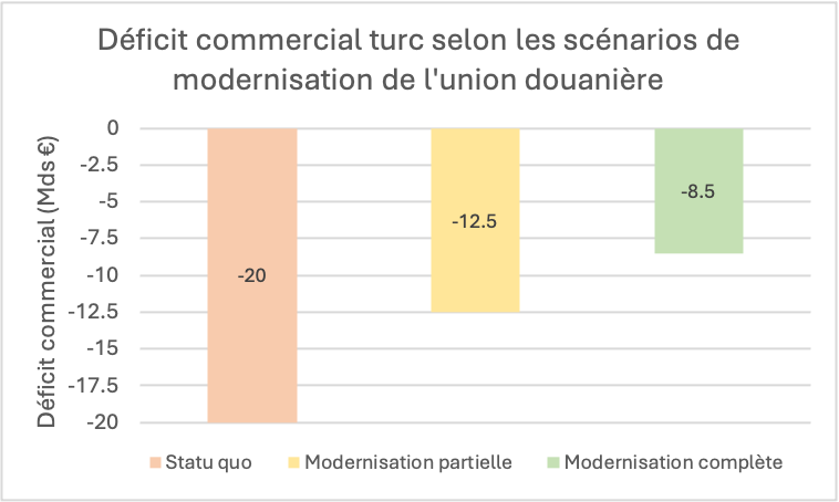 Dans ce scénario de modernisation partielle, avec une ouverture des marchés publics et de certains services (logistique, transport, e‑commerce) ainsi qu’un engagement de la Türkiye sur la convergence réglementaire en matière environnementale et numérique, sans intégration complète de l’agriculture, la balance commerciale turque pourrait s’améliorer d’environ 30%, ramenant le déficit commercial turc à -12,5 milliards d’euros. Le PIB turc augmenterait de 1% à 1,5%. L’UE bénéficierait, en retour, d’un accès renforcé au marché turc des services, et de l’élimination de certaines barrières techniques.